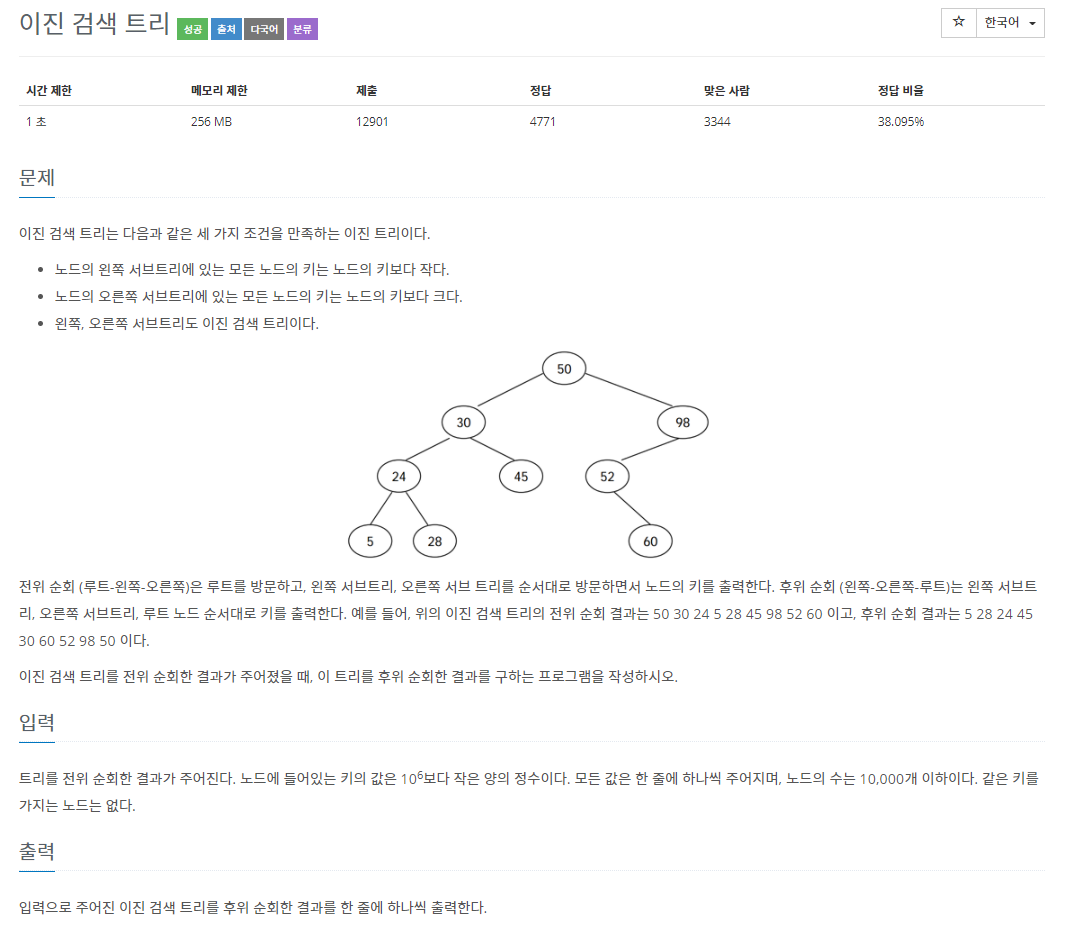 트리 순회 문제 중, 인오더와 포스트오더가 주어졌을 때 프리오더를 구하는 문제가 있었는데 그 문제와 유사하게 생각하면 좋다. 이번에는 프리오더만 주어지지만 추가적으로 '이진 검색 트리'라는 트리의 속성을 이용하여 문제를 해결할 수 있다.