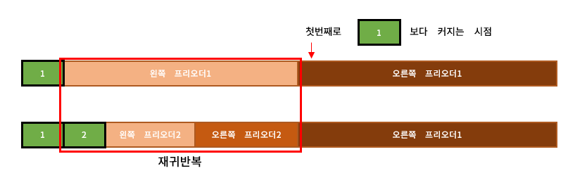 - 이후 주어진 프리오더를 탐색하다가 루트보다 커지는 첫번째 요소부터 루트의 오른쪽 트리이다.