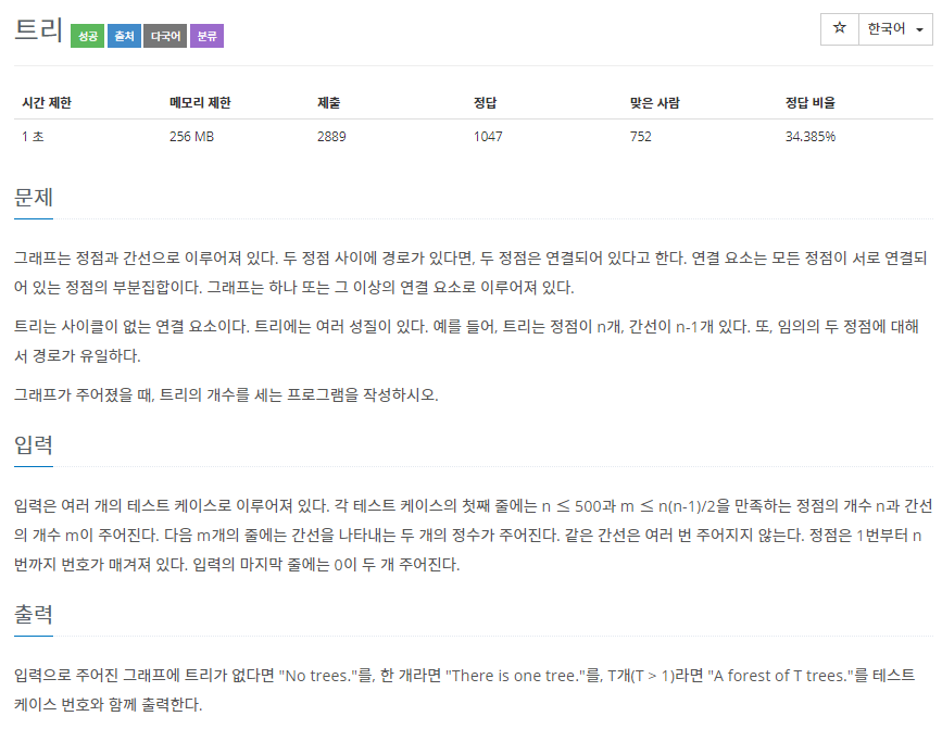 서로 연결된 '연결 요소'가 싸이클을 이루는지 아닌지 체크하여 싸이클이 아닌 연결 요소의 개수를 세어주면 된다. 주의할 점은 다른 정점에 연결되지 않은 외딴 정점 또한 트리의 조건에 부합한다는 것이다.