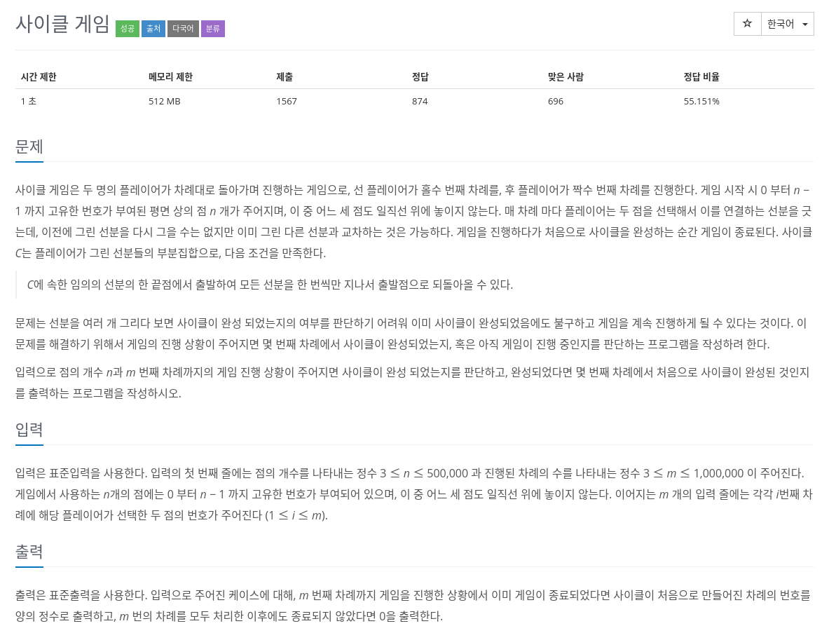 유니온파인드 알고리즘을 수행하면서 i 번째 단계에서 주어진 두개의 수의 루트 노드가 같으면 싸이클이 이루어지므로 i를 출력해주고 연산을 마친다.