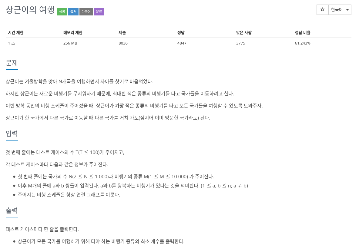 처음 문제를 보자마자 답은 n - 1 인 것을 알았다. 그래도 탐색을 통해 답을 구하는 방법이 없을까 고민하여 BFS 알고리즘을 이용하여 풀게 되었다. BFS 알고리즘을 통해 순환하면서 새로운 경로를 통해 새로운 정점을 만나면 카운트해주는 방법이다.