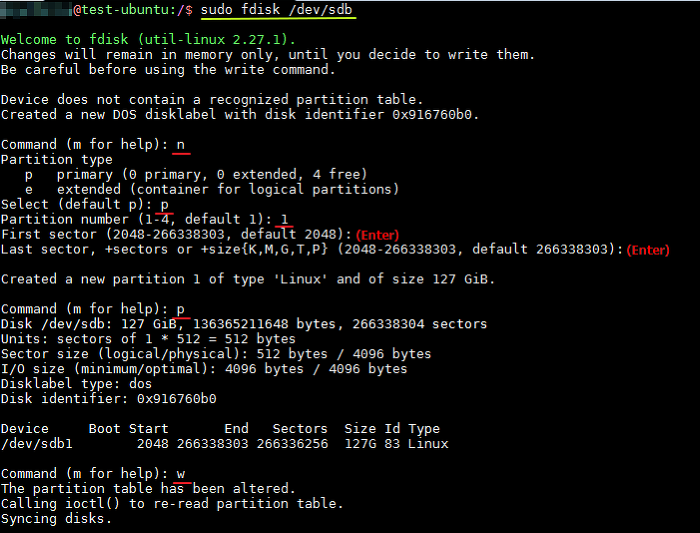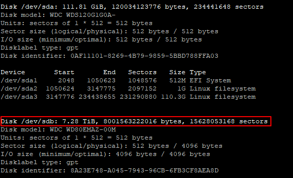 보통 우분투를 설치한 메인 디스크는 /dev/sda의 이름을 가지고, 두번째부터 sdb, sdc... 의 이름을 가진다. 새로 설치된 하드의 용량 등을 잘 확인하여 내가 마운트하고자 하는 디스크가 맞는지 확인한다. 아래부터는 sdb의 이름으로 설명을 진행하려고 한다. 만약 이름이 다르다면 sdb 부분만 바꿔가며 진행하면 된다.