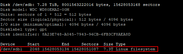 파티션을 생성한 후에 다시 한번 디스크 목록을 확인해보면 기존 /dev/sdb 에 추가하여 그 아래에 /dev/sdb1 이 생성된 것을 볼 수 있다. sdb라는 디스크 아래에 sdb1이라는 파티션이 생성된 것이다.