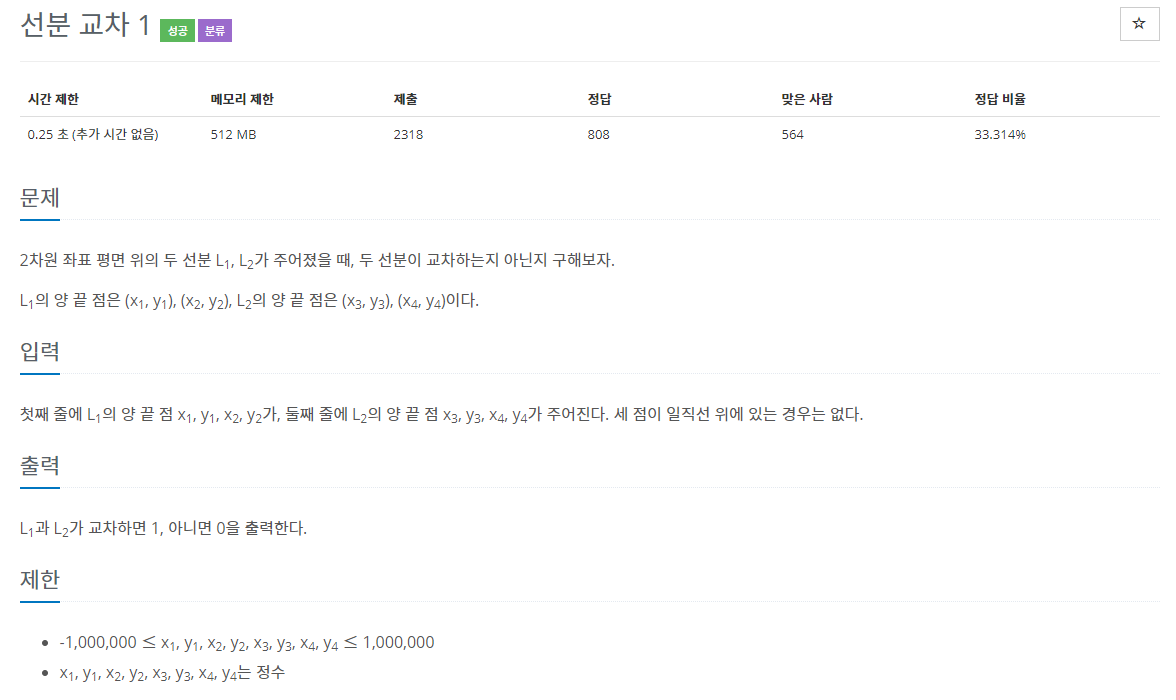 이전 문제에서 사용한 CCW를 체크하는 알고리즘을 이용하여 서로 교차하는지 확인할 수 있었다.