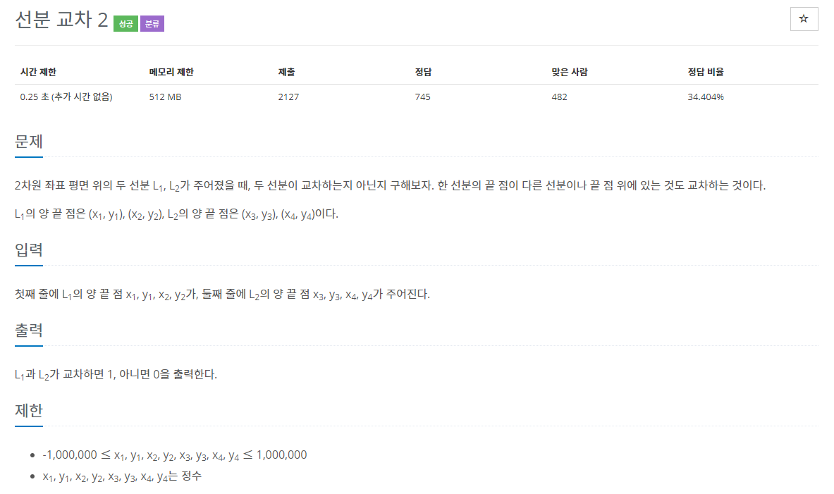 선분 교차 1번 문제: 2021.05.06 - [코딩/백준 (Python)] - 백준 17386번: 선분 교차 1 (Python)