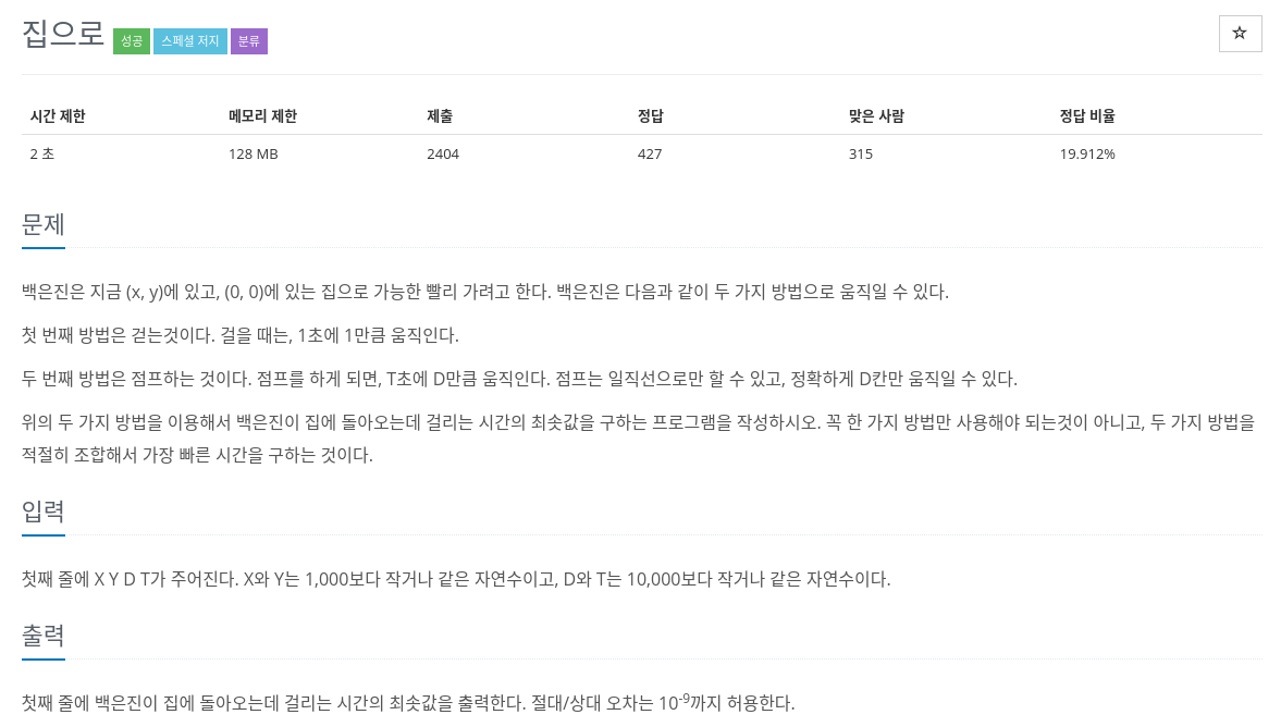 처음에는 직선으로 하는 이동만 생각해서 d 로 뛸 수 있는 만큼 뛰고 남은 거리를 걷거나, 거기서 한번 더 뛰고 다시 뒤로 걷는 두가지 경우만 생각했지만, 한번 틀리고 다시 생각해보니 두가지를 놓쳤다는 것을 알 수 있었다.