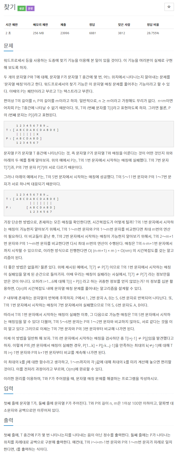 접근 방법은 문제에 주어져 있다. 주어진 방법대로 문제를 풀었는데 혼자서는 40% 시간초과를 넘기기가 힘들어 KMP 알고리즘에 대해 공부도 하고, 다른 분들의 코드를 참고하여 풀 수 있었다.