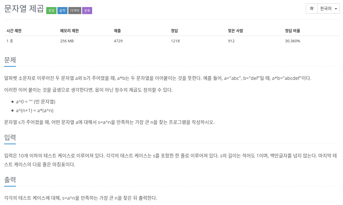 KMP 알고리즘을 이용하여 KMP table 구할 수 있다. 이 table 의 가장 마지막 숫자를 확인하고, 문자열 전체 길이를 이 수로 나누었을 때 나누어 떨어지지 않으면 반복이 0회, 즉 답이 1이고, 나누어 떨어진다면 그 몫이 답이다.