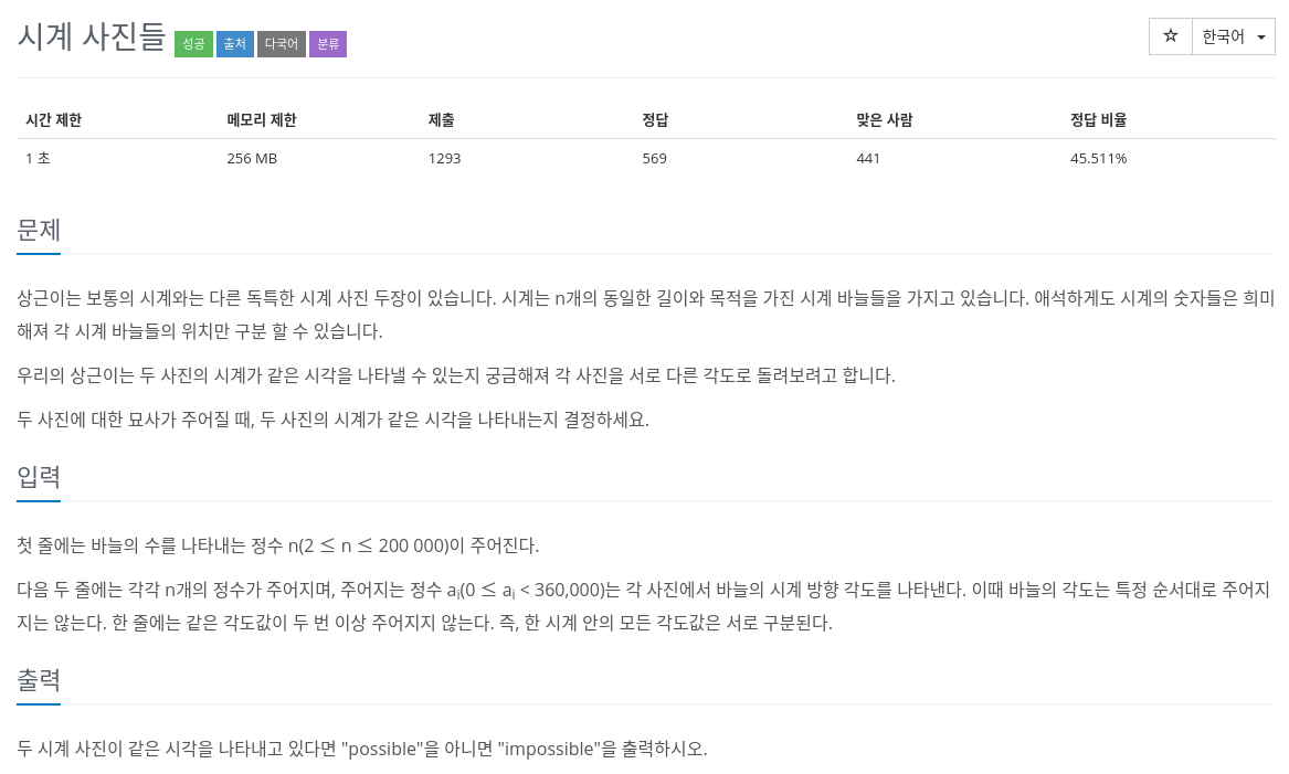 각도는 1부터 360,000까지의 값을 가진다. 각 시계에 해당하는 0의 요소를 360,000개 가진 리스트 두 개를 만들고, 각각의 시계 사진이 가지는 각도 값들에 해당하는 요소를 1로 바꾸어준다. 그리고 KMP 알고리즘을 이용하여 두 개의 리스트를 비교하면 된다.