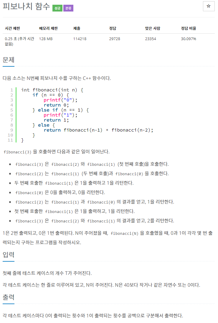 단순 재귀함수로 풀었을 때 피보나치 수를 구하기 위해 많은 시간이 걸린다고 한다. 당연하게도 그냥 피보나치 수를 구하는 재귀함수에 n = 0, n = 1일때마다 카운트하게 코드를 작성하면 시간 초과가 되게 된다.