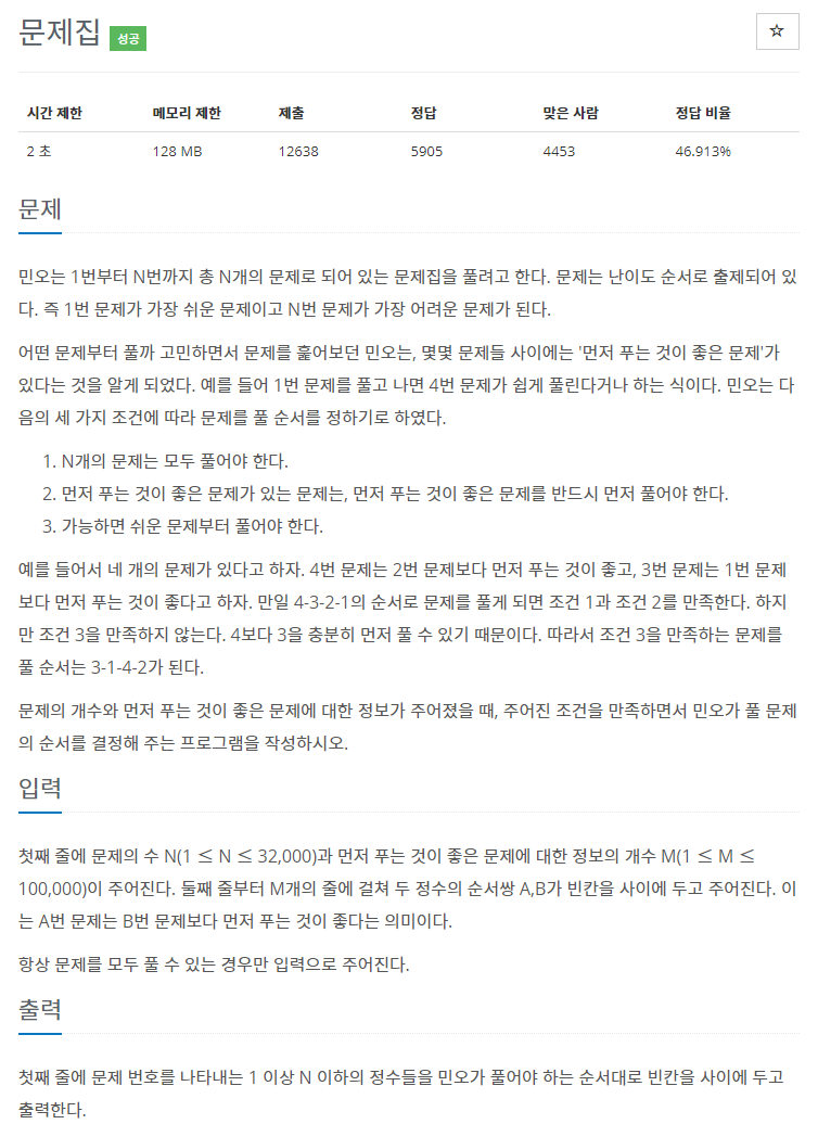 문제집을 풀 때 먼저 풀어야 하는 문제가 있다는 점에서 위상 정렬 알고리즘을 이용하고, 풀 수 있는 문제 중에서 가장 난이도가 쉬운 문제, 즉 가장 숫자가 작은 문제 먼저 푼다는 점을 추가적으로 고려해주면 풀 수 있다.