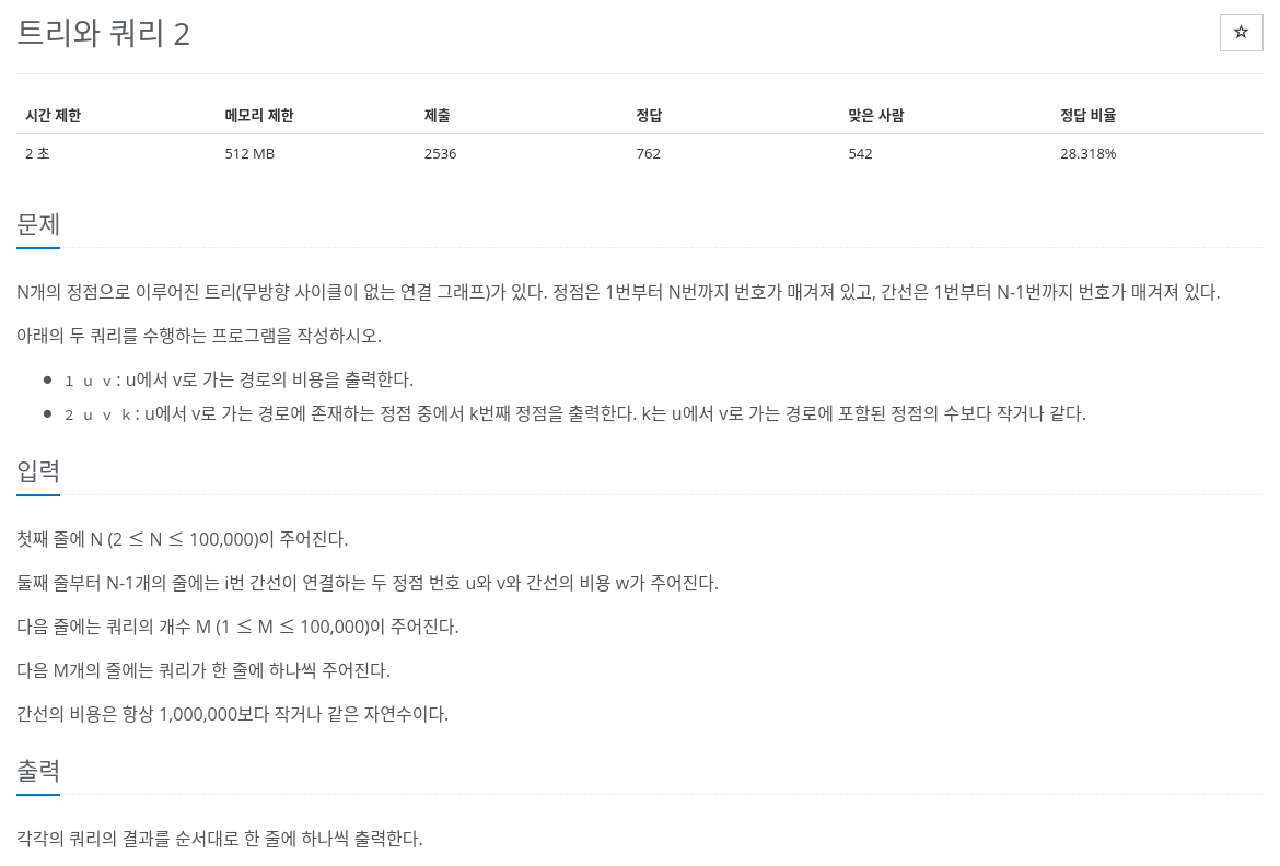 이전에 풀었던 도로 네트워크 문제와 유사한 문제였다. 오히려 조금 더 간단했던 것 같다. 도로 네트워크 문제에서 거리 저장 개념을 가져오고, k 번째 노드를 구하는 것도 LCA 구하는 것과 마찬가지로 탐색하면 된다. 물론 문제에서 요구하는 것이 많아서 코드는 훨씬 길어지게 되었다.