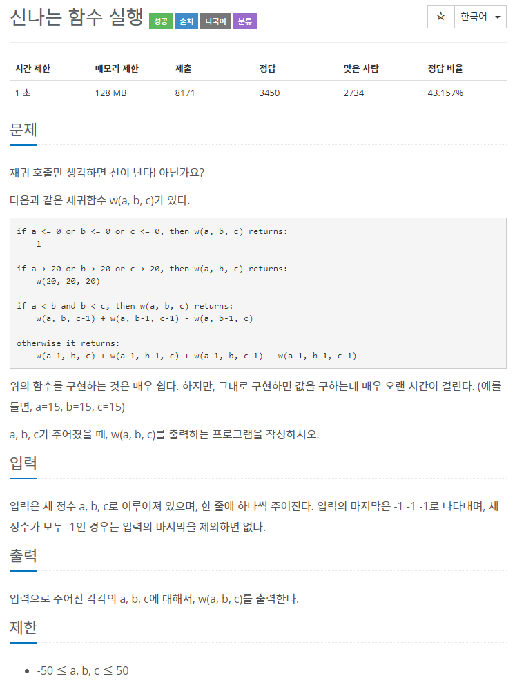 w(1, 1, 1) 부터 w(20, 20, 20) 까지 모두 미리 계산해두고, 조건에 따라 값을 리턴해주는 방법으로 수행해도 백준에서 답안 제출 시 동일한 시간, 동일한 메모리를 사용한다.