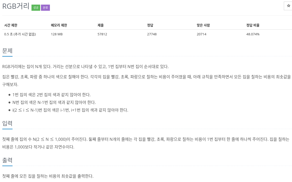 - min_price[i][j] = i 번째 집에 j를 선택했을 때 채색 비용의 최소값