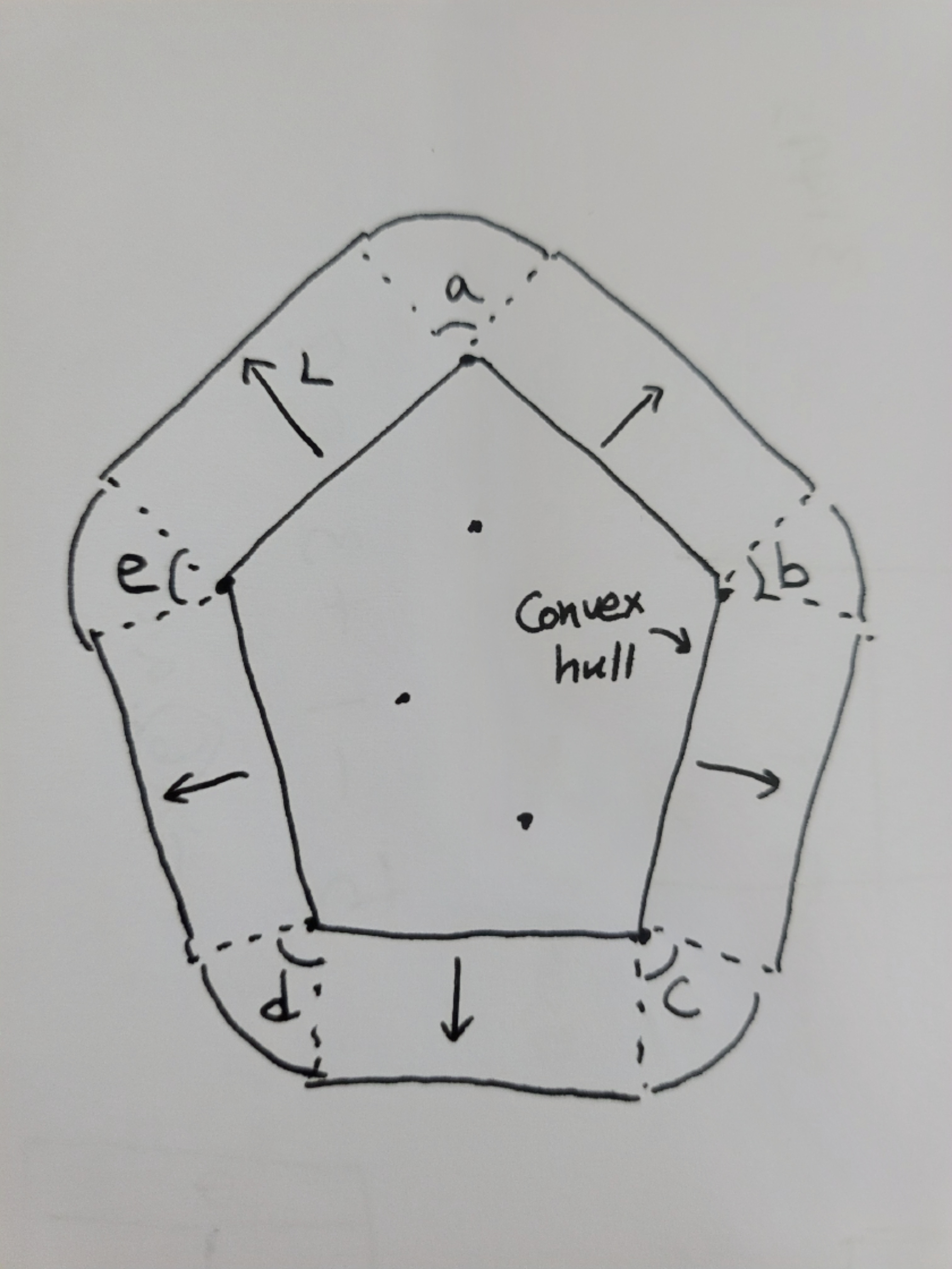 위의 그림에서 내부 오각형이 컨벡스헐이고 문제에서 주어진 L 만큼 평행이동한다면, 컨벡스헐 도형의 꼭짓점 사이의 거리의 합이 맹독 장벽의 거리 계산에 이용될 수 있다. 그리고 그림에서 원주의 각도 a ~ e의 합은 항상 360도이다. 이는 어떤 도형이던지 볼록 다각형일 경우 성립한다.