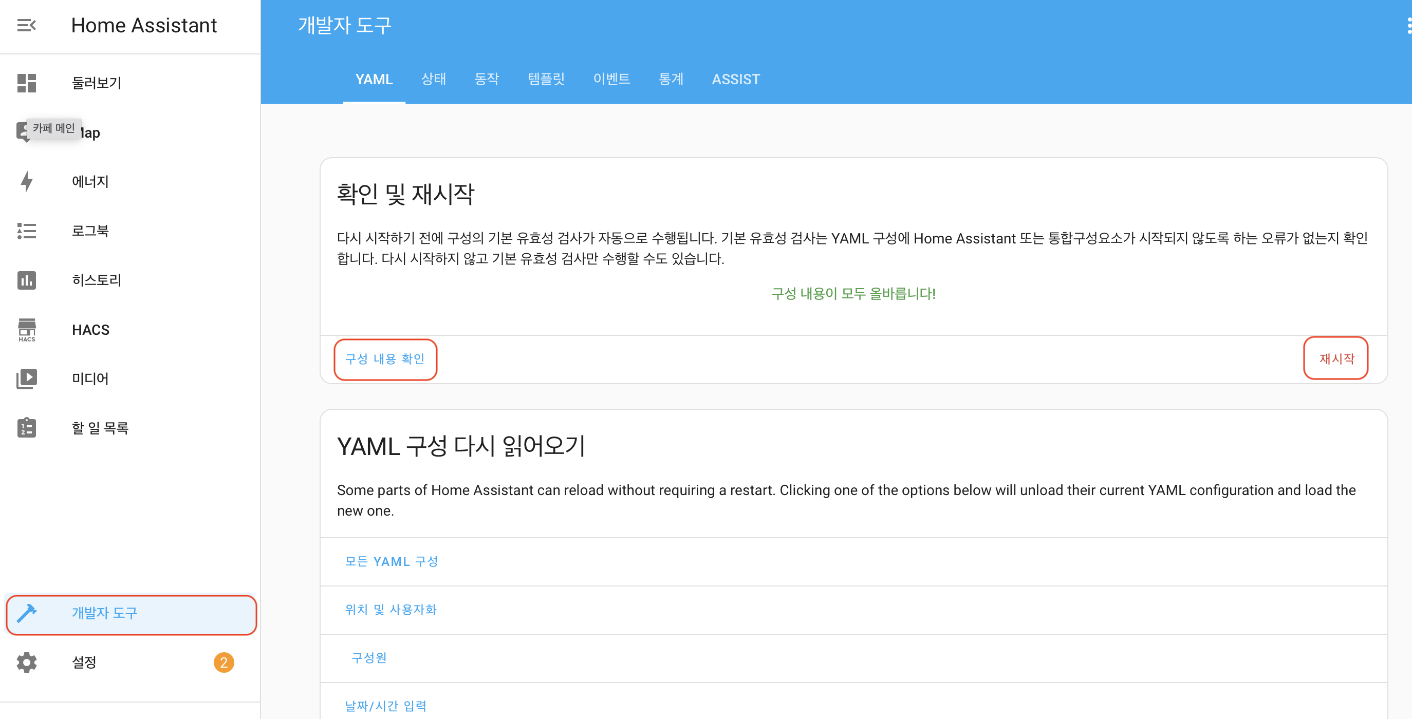 설치가 완료되었으면 HAOS를 재부팅해주어야 하는데, 개발자도구 메뉴에서 진행할 수 있다.
