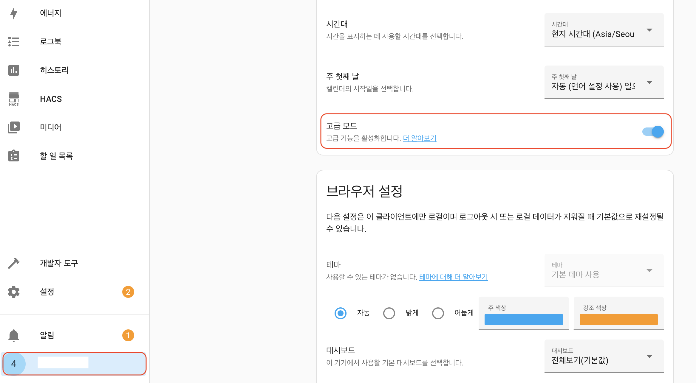 가장 먼저 왼쪽 하단 아이디를 클릭하고, 고급 모드를 활성화 해준다.