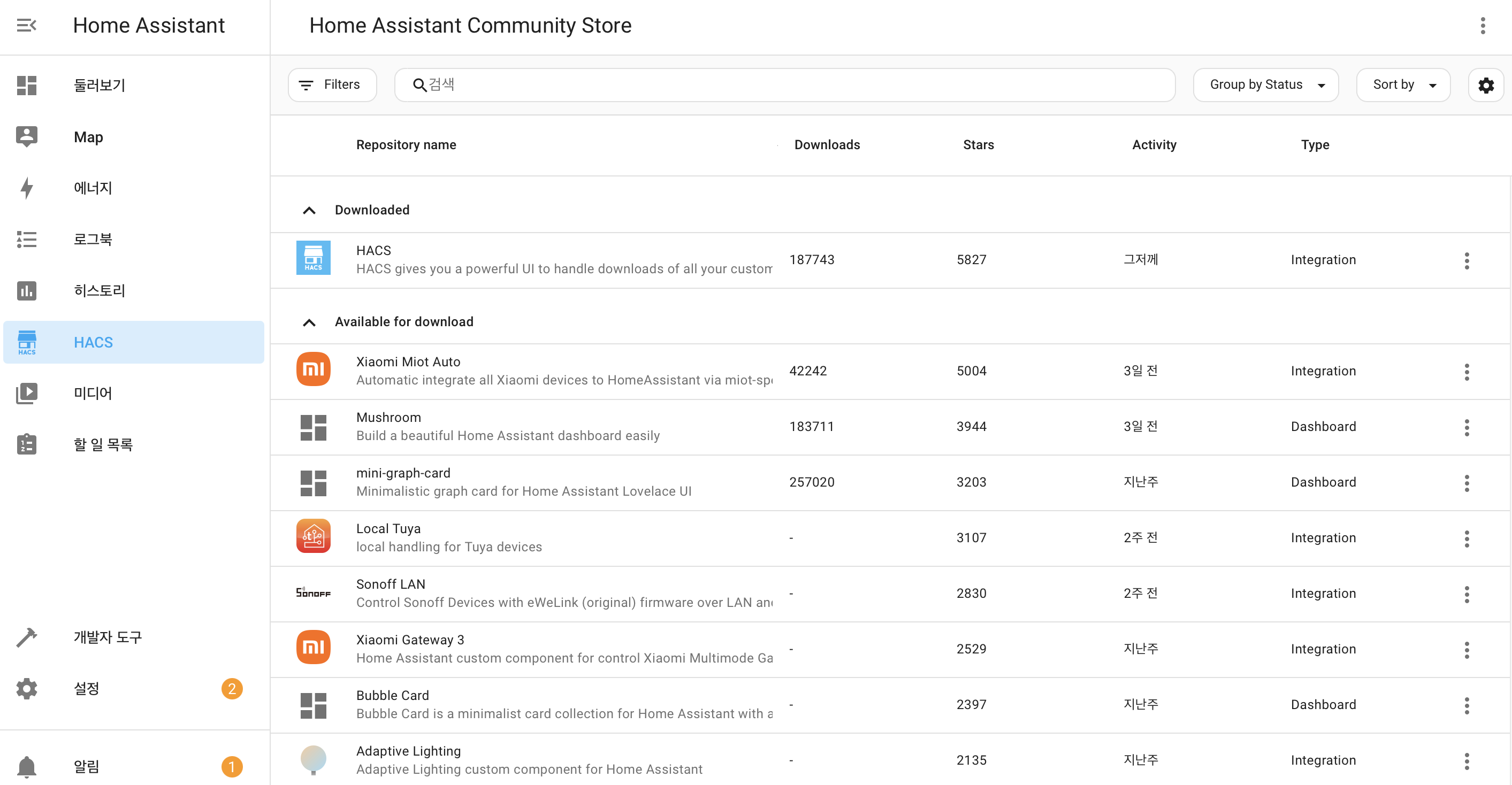 이제는 각종 장치들을 연결할 준비를 해야하는데, 그 첫번째가 Home Assistant Commuity Store(줄여서 HACS)로 HomeAssistant 시스템의 앱스토어라고 보면 된다.