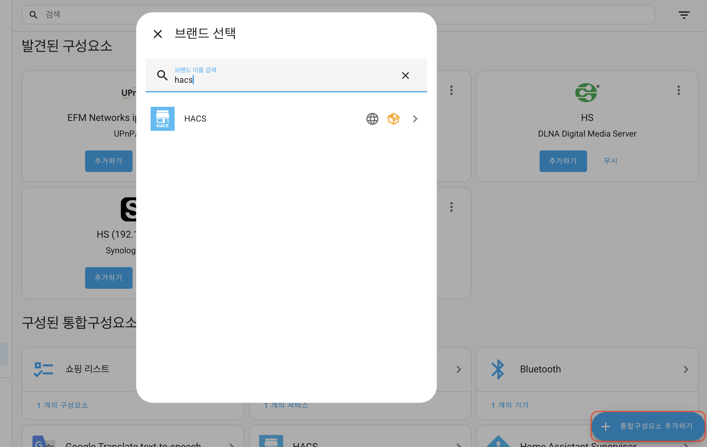 오른쪽 하단 "통합구성요소 추가하기"를 클릭하고 haos를 검색하여 클릭해준다.
