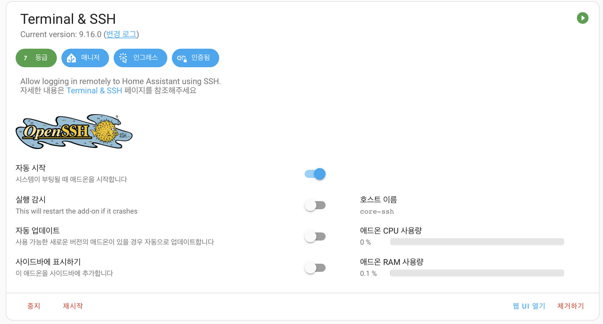 설치하고 나면 아래와 같은 화면을 볼 수 있는데, 여기에서 [웹 UI 열기]를 클릭해주면 HAOS를 처음 시작했을 때 보았던 cli 화면이 나오게 된다. 이렇게 함으로써 cli에서 작업할 일이 있을 때 HAOS에 직접 입력하지 않고도 작업을 할 수 있다.