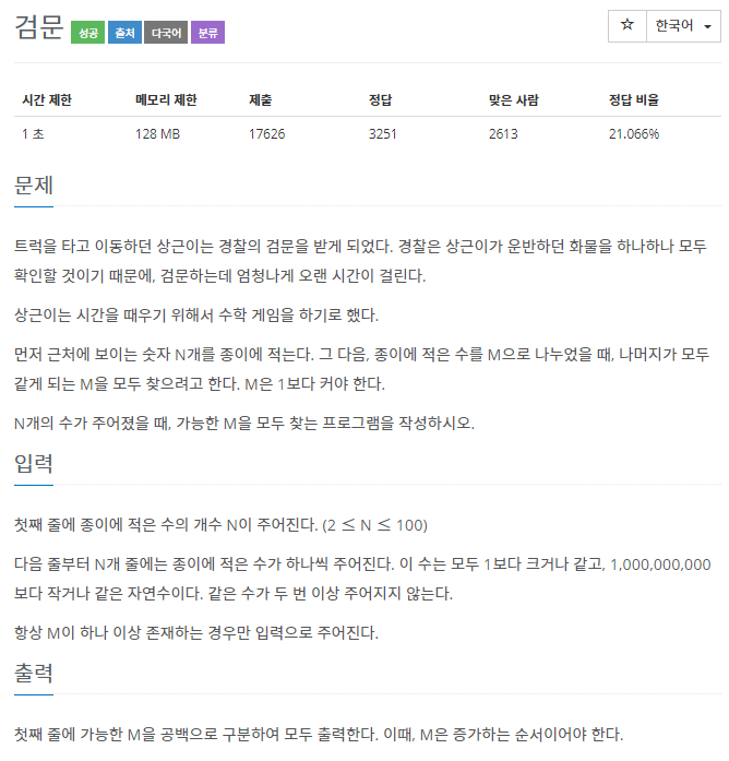 A - B와 B - C는 M을 공약수로 가지게 되며, 두 수의 최대공약수를 LCM이라고 할 때, LCM의 약수들은 모두 M이 될 수 있다. 즉 N개의 숫자가 주어질 경우, A-B, B-C 등 N[i] - N[i - 1]은 N - 1개의 숫자로 나타게 되며, N - 1 개의 숫자들의 최대공약수를 구하고, 이 최대공약수의 약수들을 오름차순으로 표시함으로써 정답을 구할 수 있다.