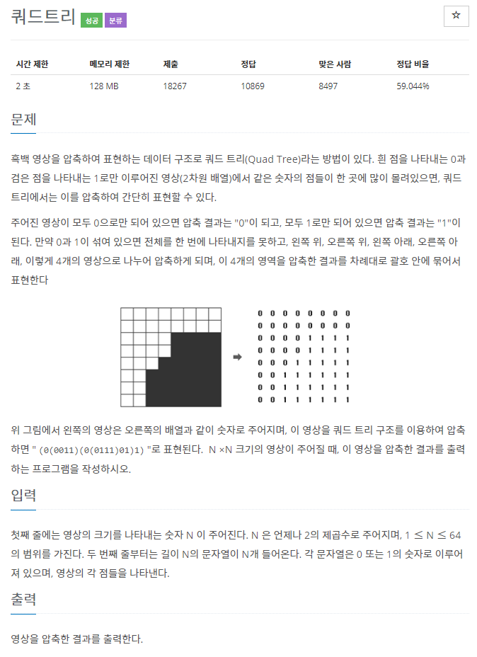 접근 분할 정복은 재귀적으로 자신을 호출하면서 연산의 단위를 줄여가는 방식이다. 이 문제에서는 전체를 확인하고, 해결되지 않았을 경우(색이 모든 칸에서 동일하지 않을 경우) 기존의 영역