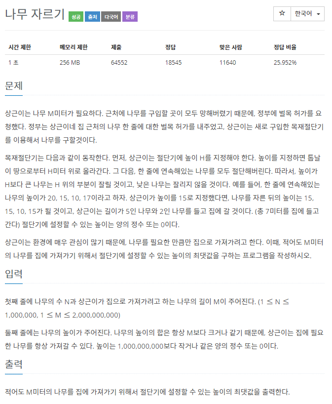 절단기가 자를 높이의 최소값, 최대값을 이용하여 최초 범위를 구하고, 이분탐색으로 높이를 탐색해가면서 잘려진 나무들의 길이 합이 목표값보다 커지는 최소값을 탐색하여 문제를 해결할 수 있다.
