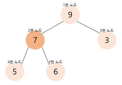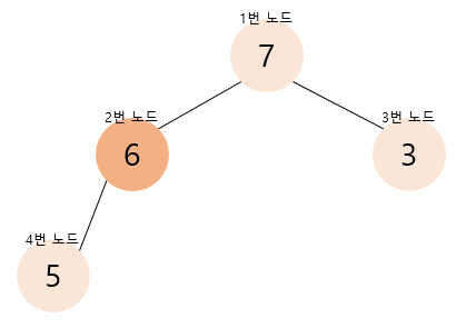 마지막 노드인 5번 노드가 1번 노드로 이동하고, 1번 노드의 두 자식 노드인 2, 3번 노드와 비교하여 더 큰 값인 2번 노드와 자리를 교체한다. 바뀌고 난 후에 2번 노드와 그 자식 노드를 비교했을 때 자식 노드들보다 그 값이 크므로 힙이 완성되고 탐색이 종료된다.