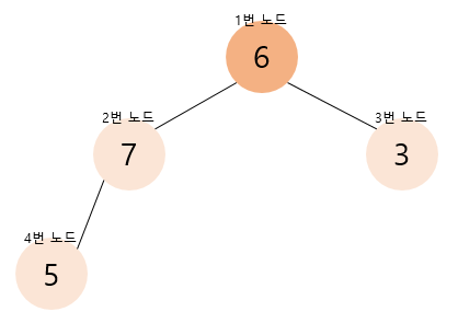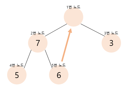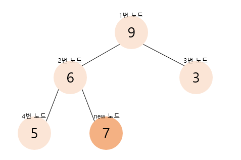 7의 값을 가진 새로운 노드가 추가되었을 때 이 노드의 부모노드인 2번노드와 비교하여 자식 노드의 값이 크기 때문에 위치를 서로 바꿔준다. 새로운 2번 노드와 그 부모 노드인 1번 노드를 비교하였을 때 부모노드가 크기 때문에 탐색은 종료되고 새로운 힙이 완성된다.