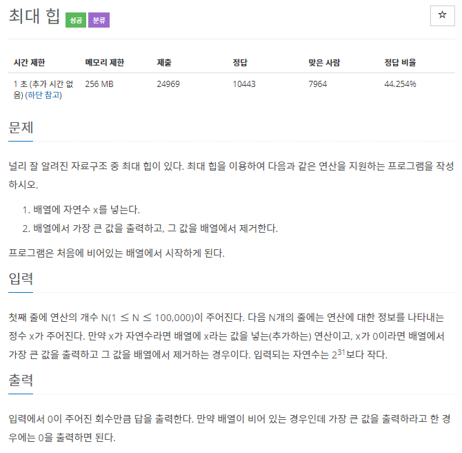 이 문제에서는 최대 힙을 사용하여 문제를 풀며, 힙의 경우에는 python에 heapq 라이브러리가 있지만 원리를 제대로 다시 이해하기 위해 힙에 요소를 추가하고 제거하는 함수를 작성하였다.