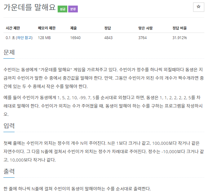 print(leftheap[0][1]) # 짝수일 때, 홀수일 때 모두 왼쪽 힙 트리의 값이 말해야 하는 수가 된다