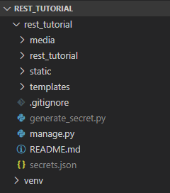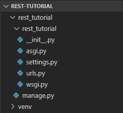 $ django-admin startproject rest_tutorial처음 프로젝트를 생성하면 다음과 같은 구조로 생성된다.