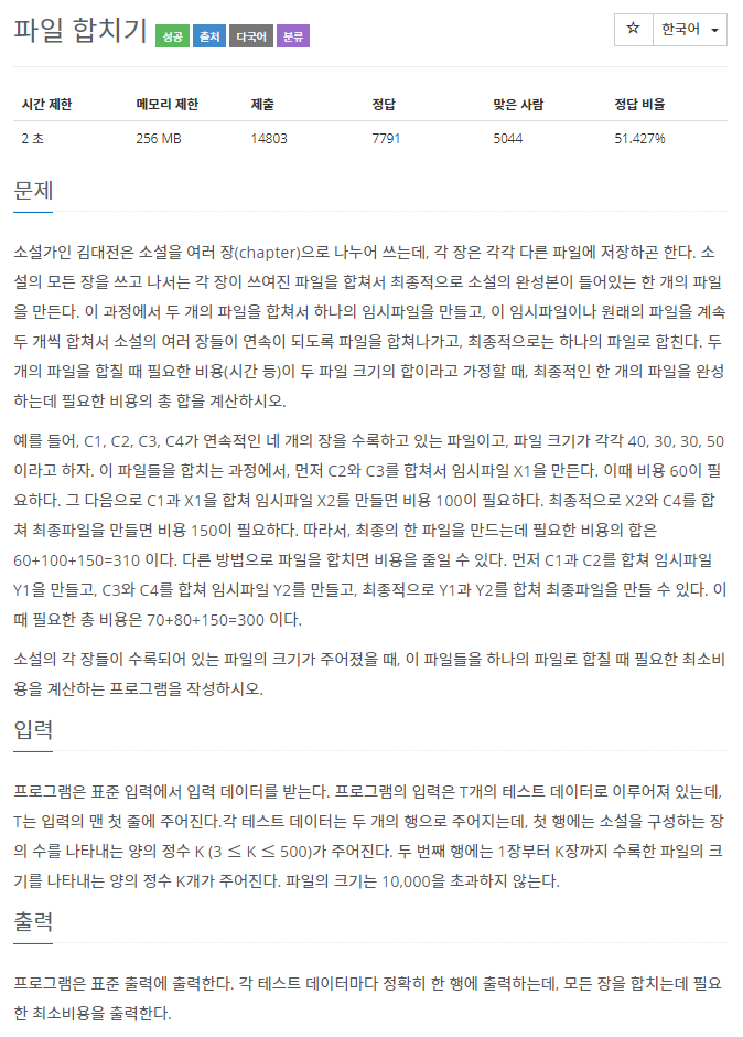 그렇다면 dp[0][n]의 값(0번 챕터부터 n번 챕터까지 합치는 최소 비용)은