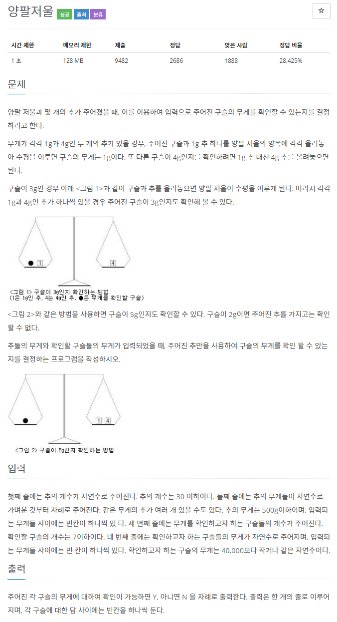 양팔 저울이 잴 수 있는 무게는 양팔에 올라간 추의 무게의 차이라는 것을 알 수 있다. 예를 들어 무게가 각각 1, 4, 9g인 추가 있다면 첫번째 1g 추를 왼쪽에 올릴 수도 있고, 오른쪽에 올릴 수도 있고, 올리지 않을 수도 있다. 그리고 두번째, 세번째 추 또한 동일하게 3가지 경우의 수를 가진다. 이 모든 경우에 대해 좌우 차이를 구하면 답을 구할 수 있을 것이다. 하지만 이렇게 풀면 당연히 시간이 초과될 것이다.