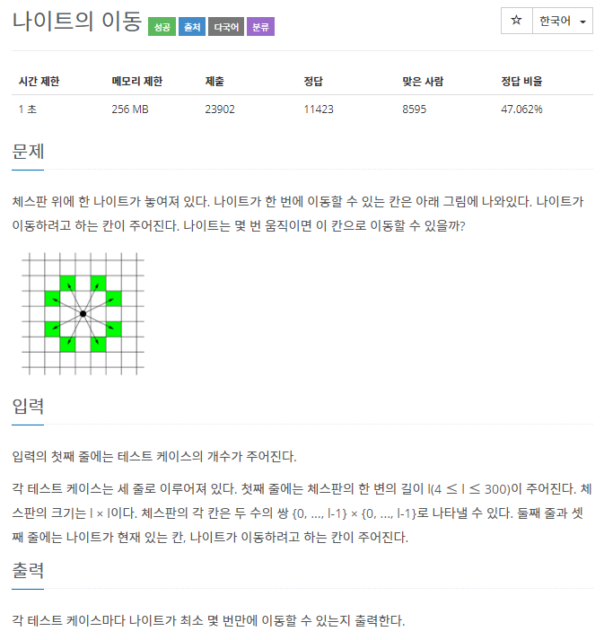 미로찾기와 동일하지만 그 이동이 위, 아래, 왼쪽, 오른쪽 4방향이 아니라 사진에 나와있는 것과 같이 나이트가 이동할 수 있는 8방향을 다음 탐색에 추가해주면 된다.