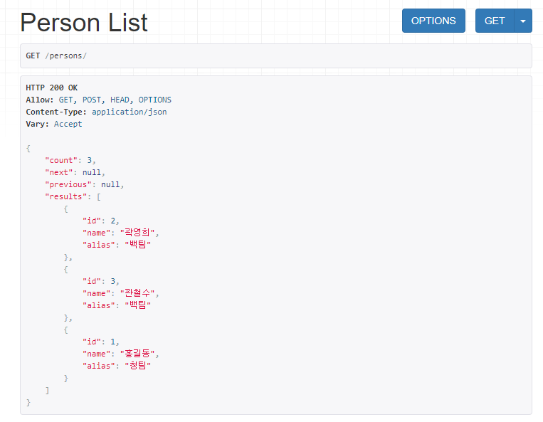 http://127.0.0.1:8000/persons/ 를 클릭하고 들어가면, 아까 이전 단계에서 임의로 생성했던 Person 모델의 인스턴스들을 확인할 수 있다.