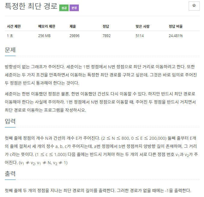 바로 전 문제인 최단 경로 문제와 유사하지만 특정 경로를 거쳐야 한다는 점과 방향성이 없다는 점을 고려하여 풀어주면 된다.