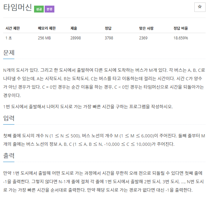기본적으로는 기존에 풀었던 최단 경로 문제에 음수 가중치를 더해주는 것 같이 보인다. 하지만 음수 가중치 때문에, 다익스트라 알고리즘을 이용할 수는 없고, 시작 노드에서 다른 모든 노드까지의 길이를 추적하는 벨만 포드 알고리즘을 이용해야 한다. (풀고 나서야 이것이 벨만 포드 알고리즘임을 알았다.)