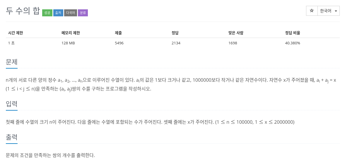 위 문제를 가장 직관적인 방법으로 푸는 방법은 2중 for문을 순환하면서 두 수의 합이 원하는 값을 표시할때마다 카운트해주는 것이다. 하지만 이 경우 시간복잡도가 O(n^2) 이기 때문에 리스트의 데이터가 커지면 시간 초과가 발생할 확률이 높다.