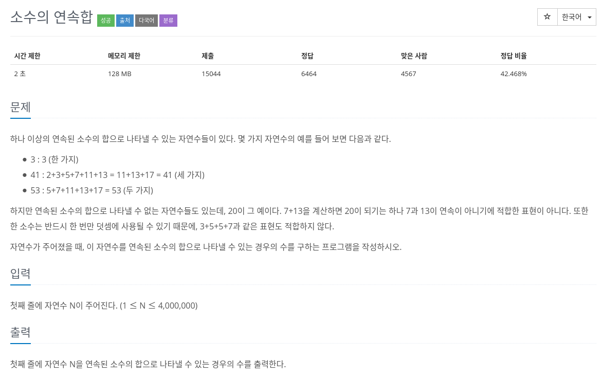 바로 이전에 풀었던 부분합 문제와 푸는 방식이 같았던 문제이다. 입력받은 n 까지의 소수를 모두 구한 후, 부분합에 사용했던 투포인터 알고리즘을 이용하여 부분합이 n과 일치할 때를 카운트하여 문제를 해결할 수 있다.